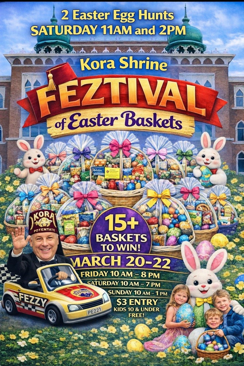 Kora Shrine Temple 11 Sabattus St, Lewiston, ME, United States2 Easter Egg Hunts 11AM & 2PM 15+ Easter Baskets to win! March 20-22 Friday: 10am - 8pm Saturday: 10am - 7pm Sunday: 10am - 1pm